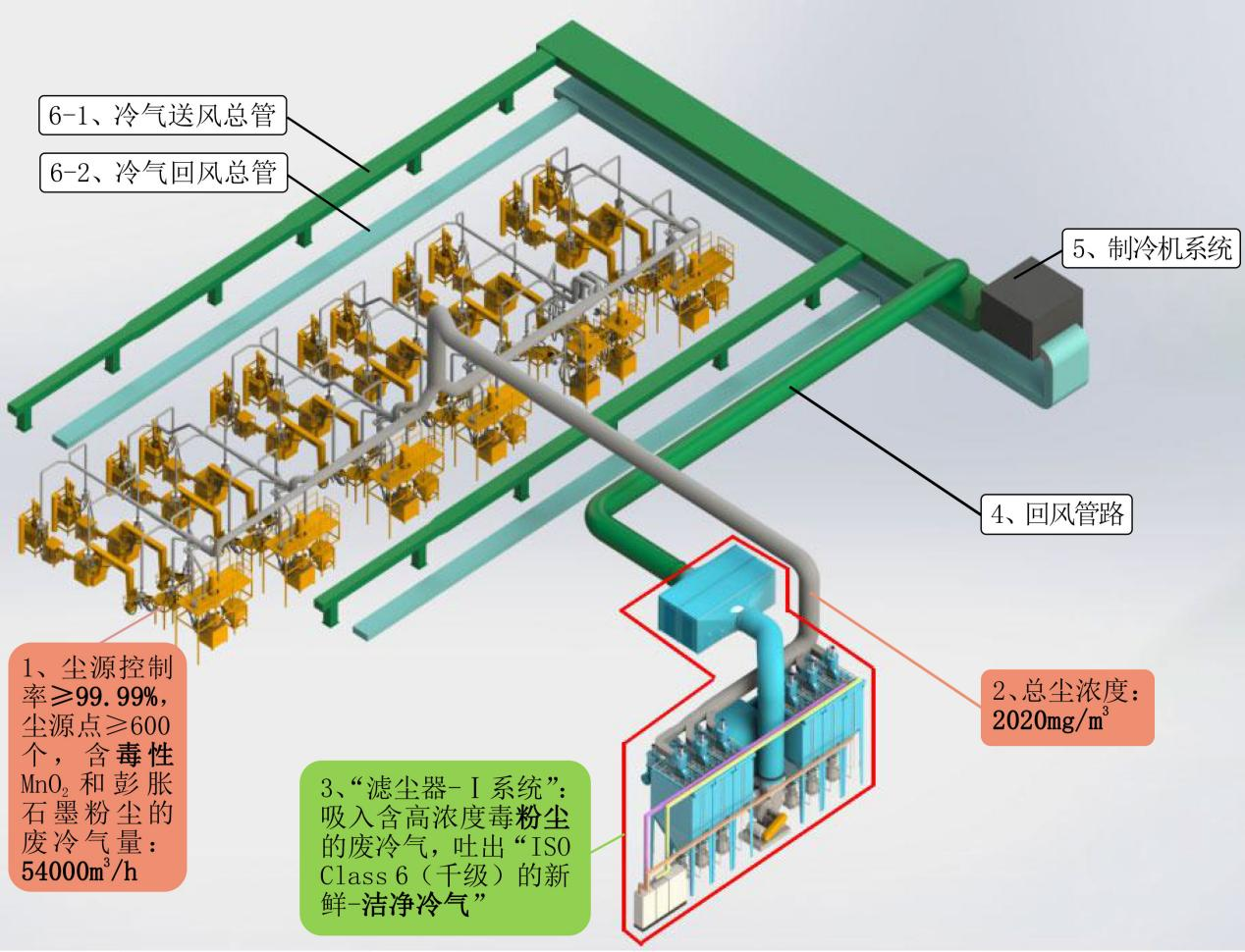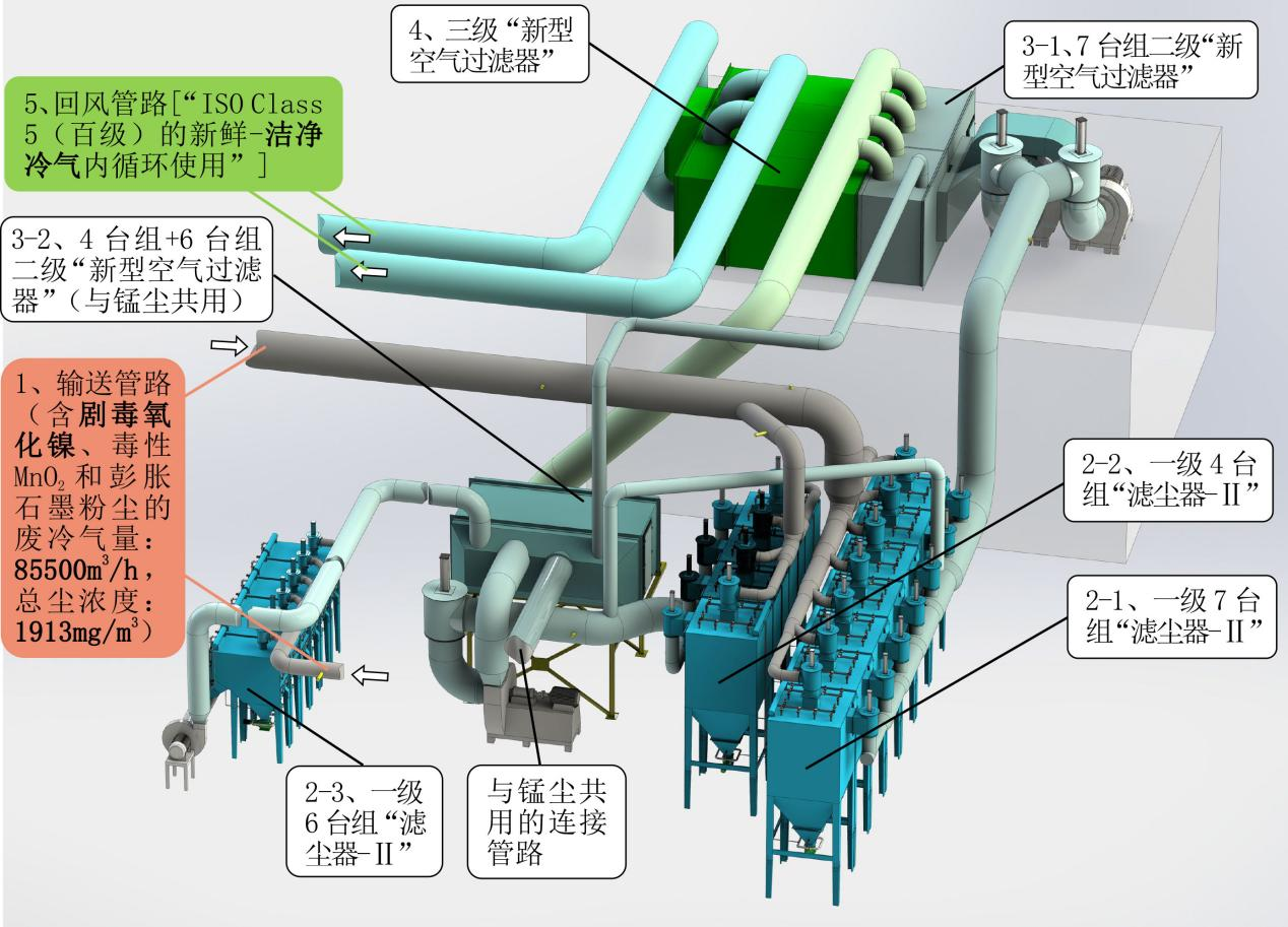 依托自主核心的顛覆性技術(shù)------“把劇毒氧化鎳+普通毒性二氧化錳+石墨粉塵污染嚴重(1913mg/m3) 的廢冷氣直接轉(zhuǎn)化為百級潔凈冷氣(≤6×10-7mg/m3, 其中,劇毒氧化鎳<10-8 mg/m3,即儀器完全檢測不到氧化鎳粉塵的存在)---100%送回車間內(nèi)循環(huán)使用”, 同步實現(xiàn):變“雙瓶頸”為“雙零”、直接成為“百級潔凈車間”、冷氣100%回收、 貴重粉塵回收率≥99.999%的四重目的。